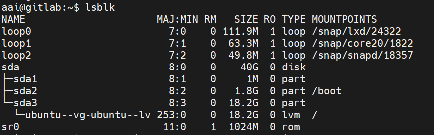sda 전체 용량은 40G 이지만, 실제 사용 가능 용량은 20G 이다.